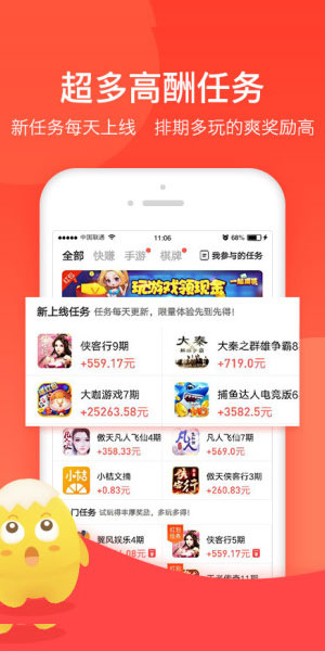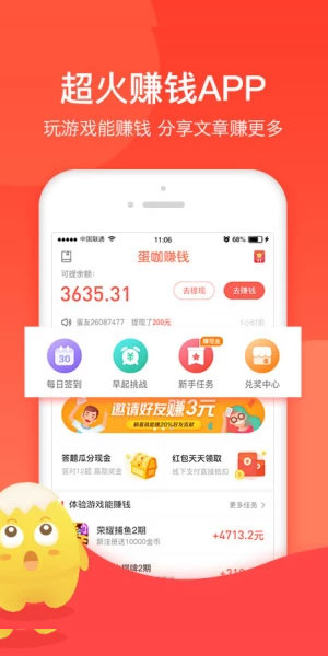 蛋咖赚钱,让你的手机变身神奇的赚钱工具,让你赚钱赚到欲罢不能!热门手游棋牌,玩就能赚钱。海量应用,体验奖现金,海量低门槛、易上手的任务等你体验,不容错过的赚钱选择!